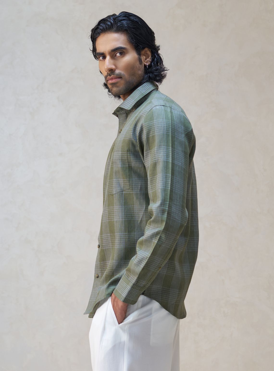 Olive Check Linen Shirt by Iravis. This sophisticated long-sleeved shirt is crafted from 100% pure linen, offering a premium feel and natural breathability for all-day comfort. It features a refined olive green check pattern, a classic point collar, a functional chest pocket, and a tailored fit