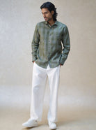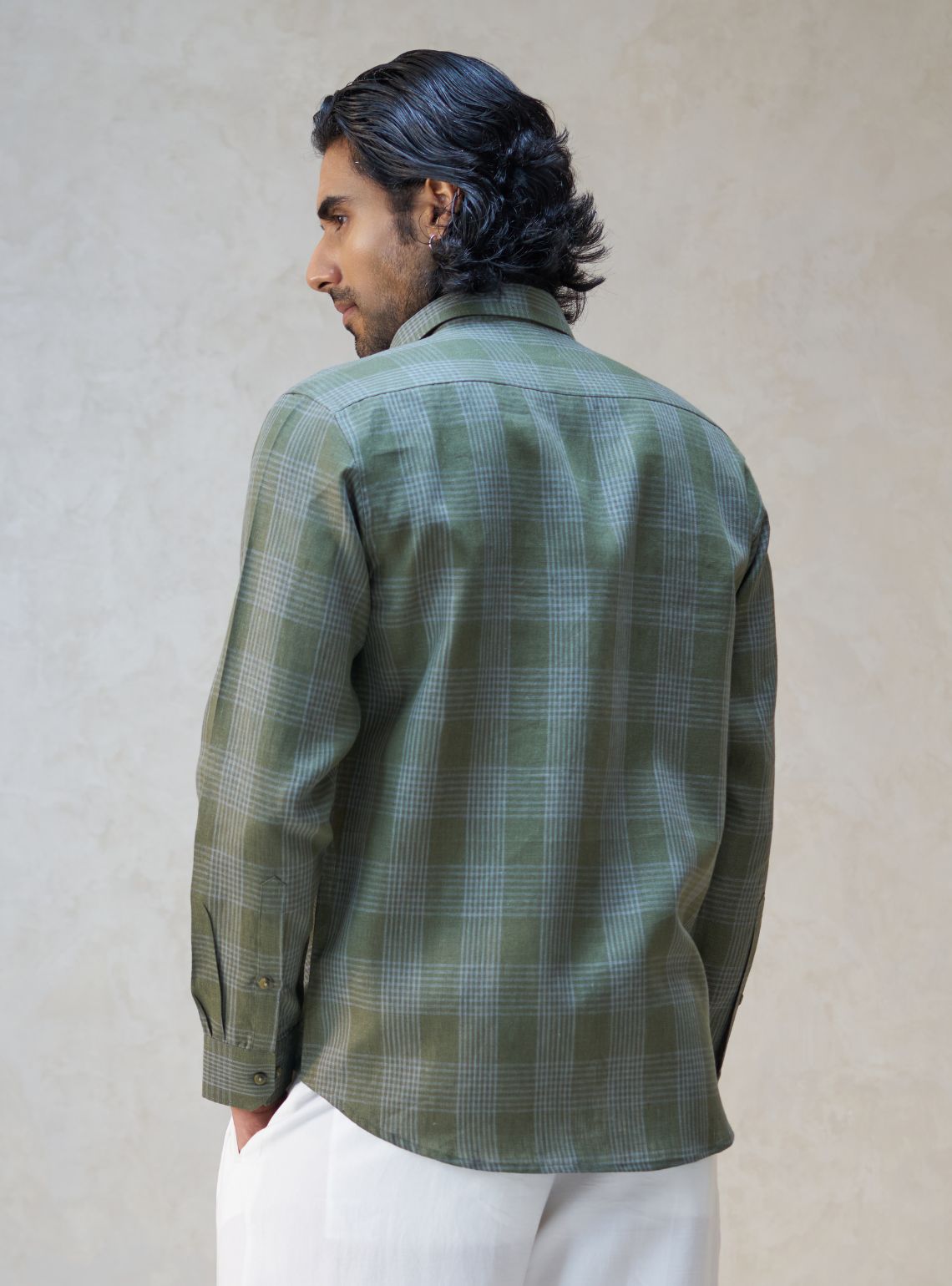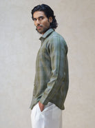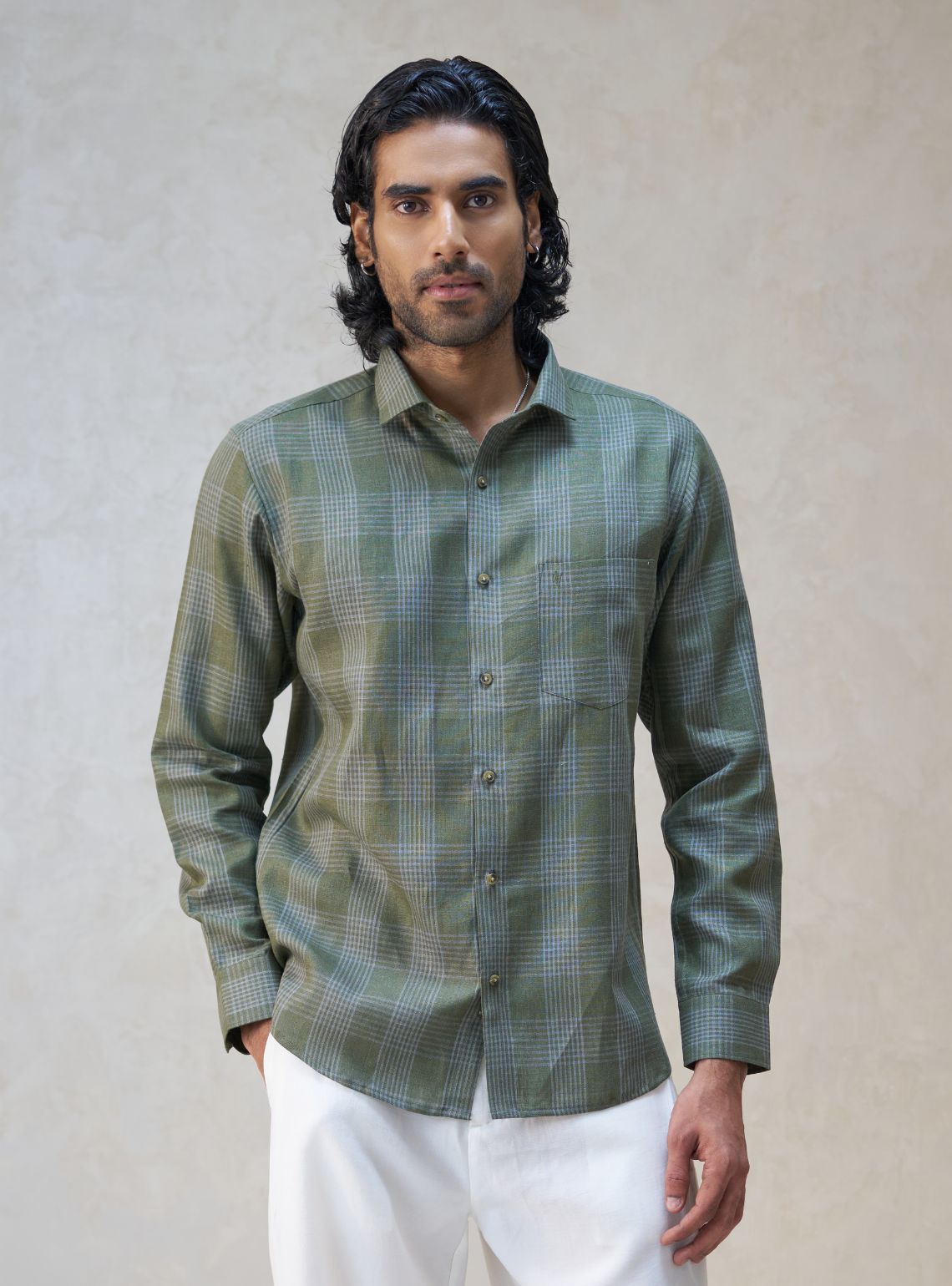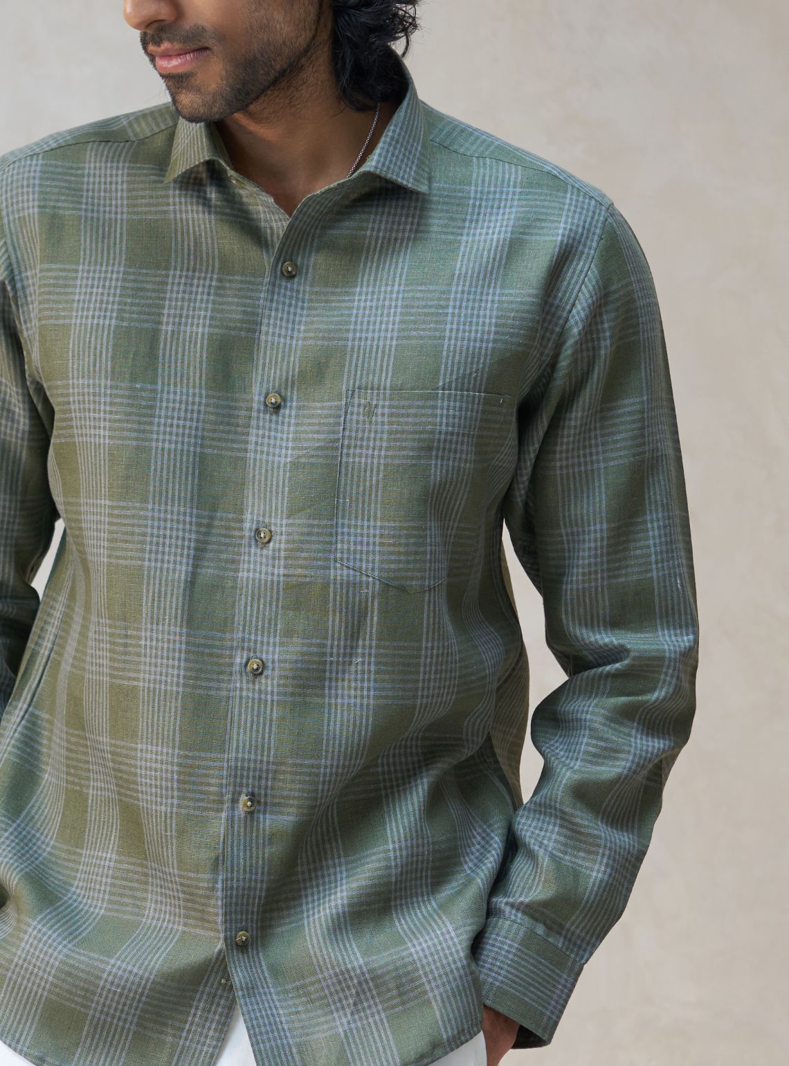 Olive Check Linen Shirt by Iravis. This sophisticated long-sleeved shirt is crafted from 100% pure linen, offering a premium feel and natural breathability for all-day comfort. It features a refined olive green check pattern, a classic point collar, a functional chest pocket, and a tailored fit