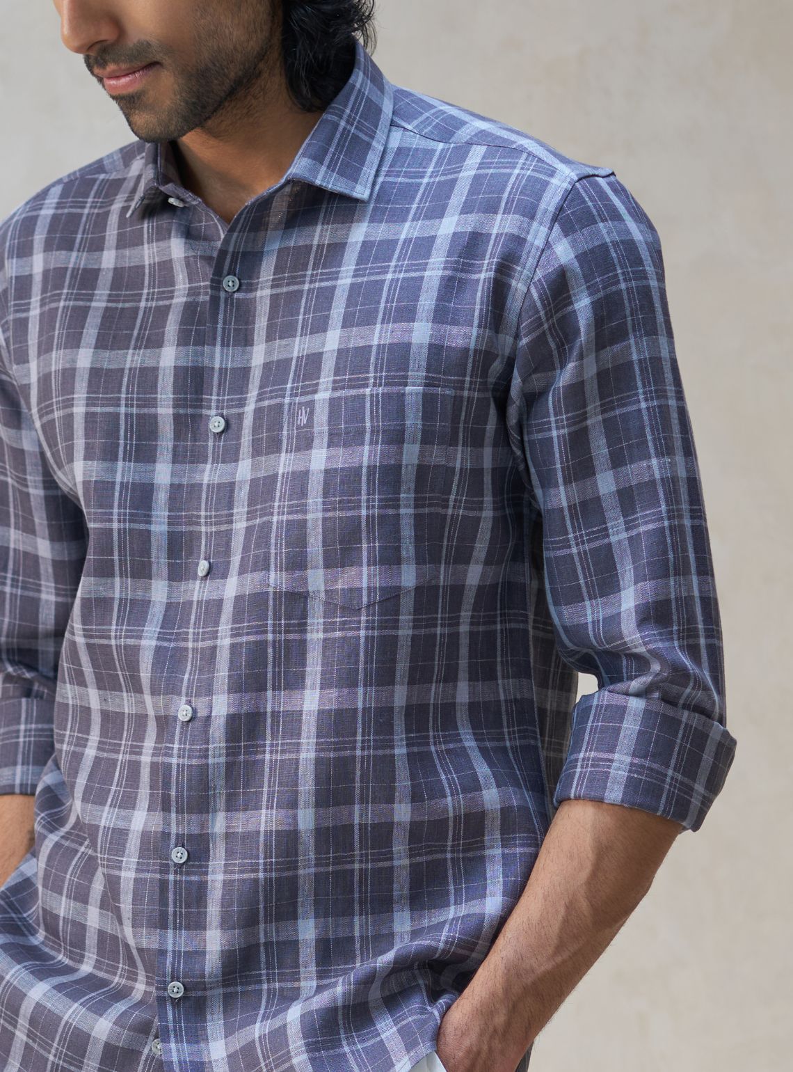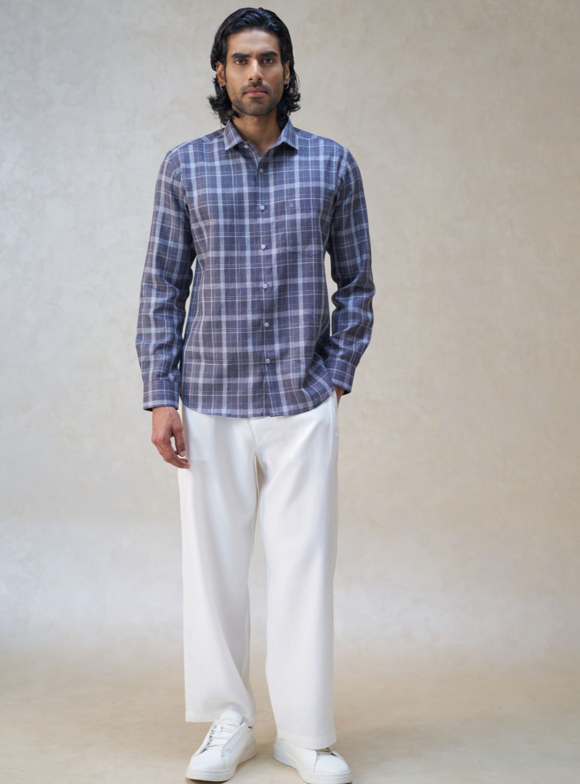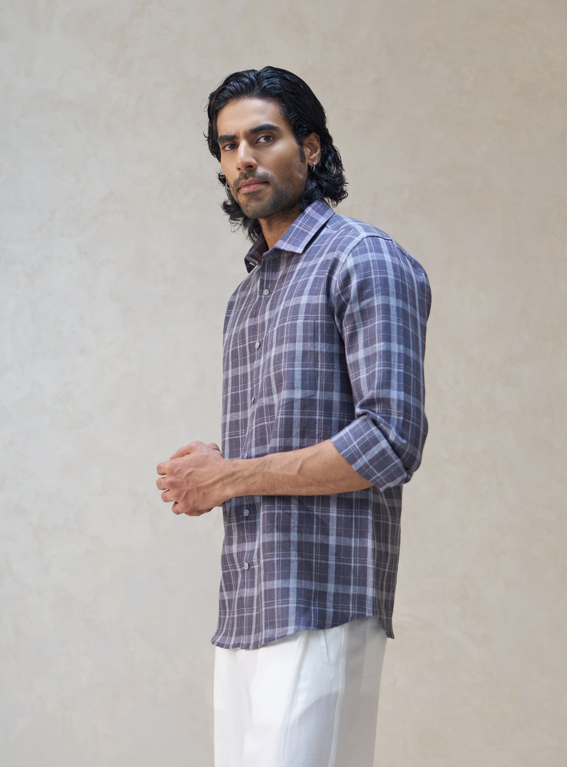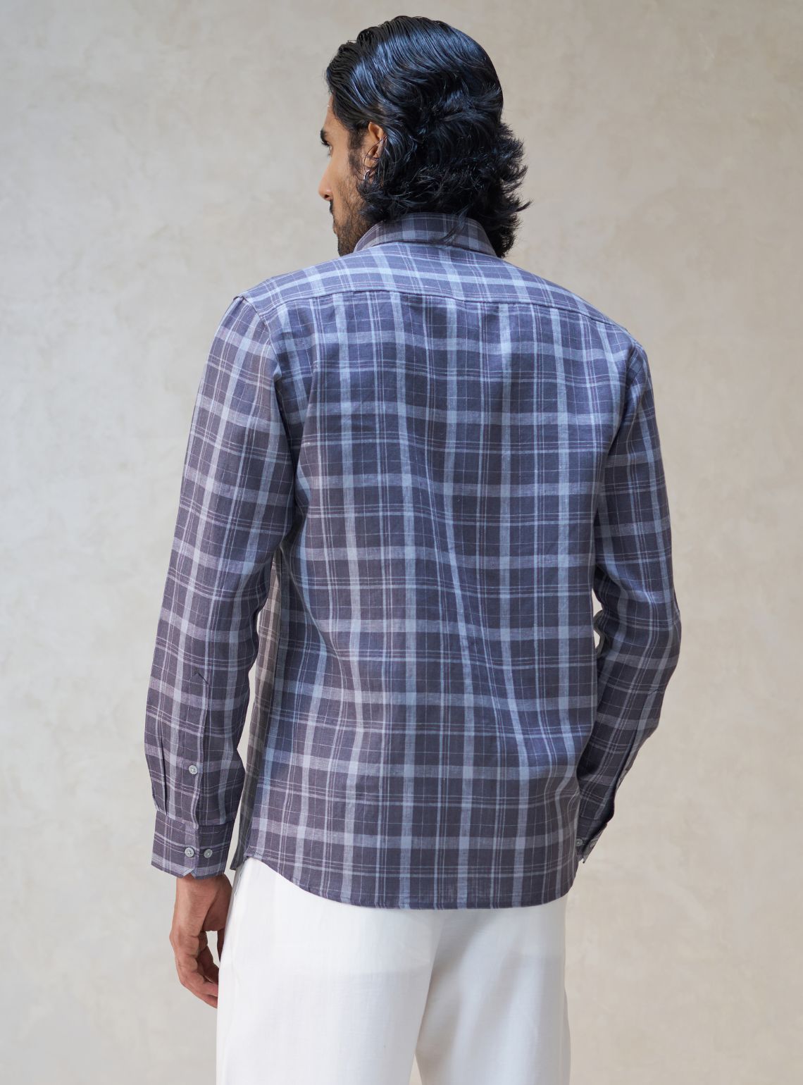 This sophisticated long-sleeved shirt is crafted from 100% pure linen, providing a premium feel and natural breathability for all-day wear. It features a classic charcoal and slate grey check pattern, a traditional point collar, a functional chest pocket, and a tailored fit.