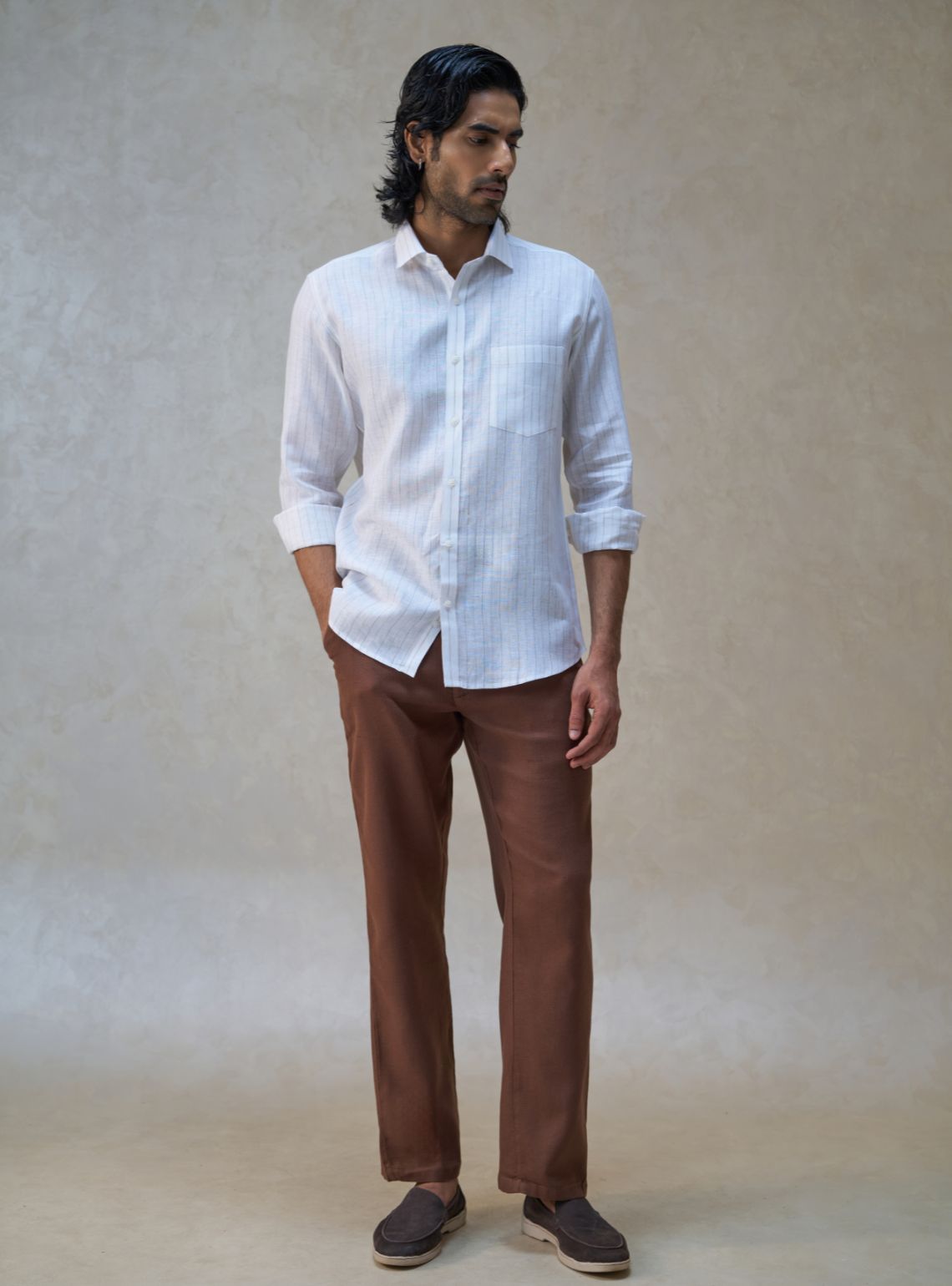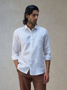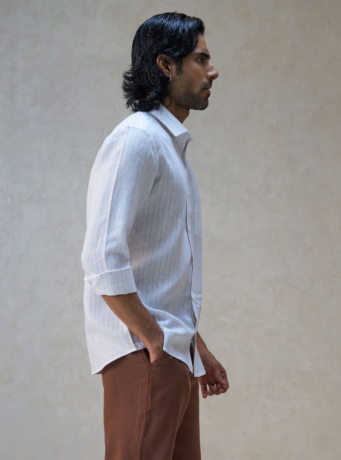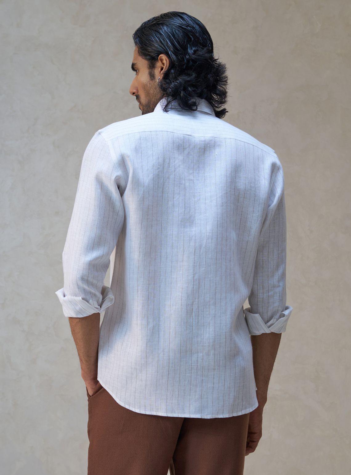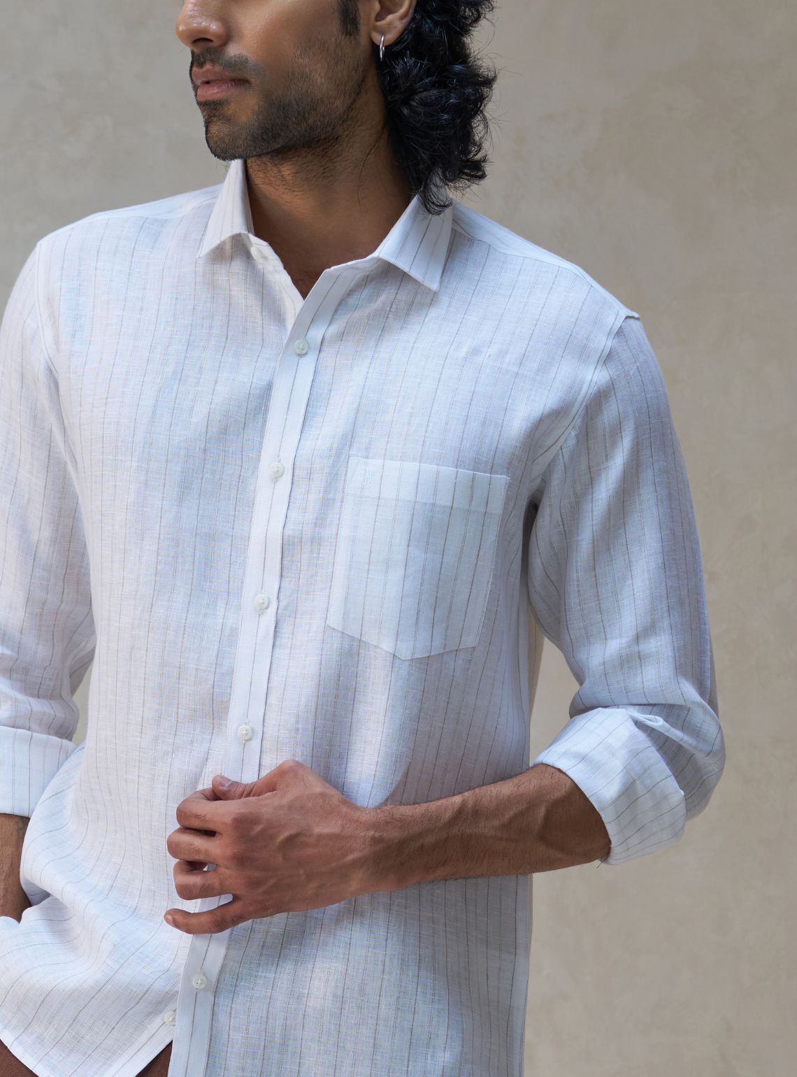 A sharp essential for the modern wardrobe, this shirt is crafted from 100% pure linen for maximum breathability. It features a crisp white base with subtle silver vertical stripes, a tailored fit, and a classic chest pocket. Ideal for smart-casual styling, it offers a refined, natural texture that transitions easily from day to night