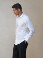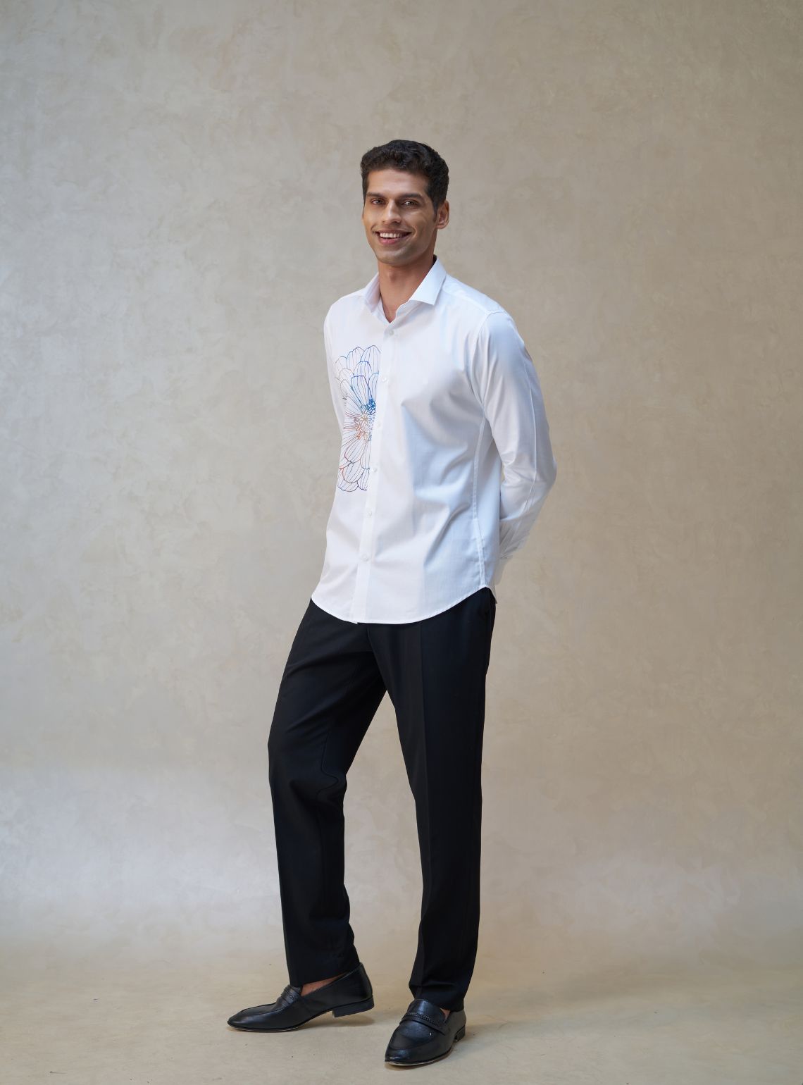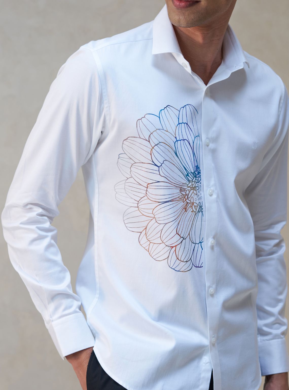 Abstract Dahlia Shirt by Mirava. This long-sleeved shirt is crafted from 100% premium cotton for a soft, breathable, and structured fit. It features a clean white base with a large, asymmetrical dahlia line drawing on the lower right. The motif transitions through a color gradient of navy, blue, and terracotta. Finished with a point collar and a tailored silhouette