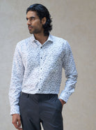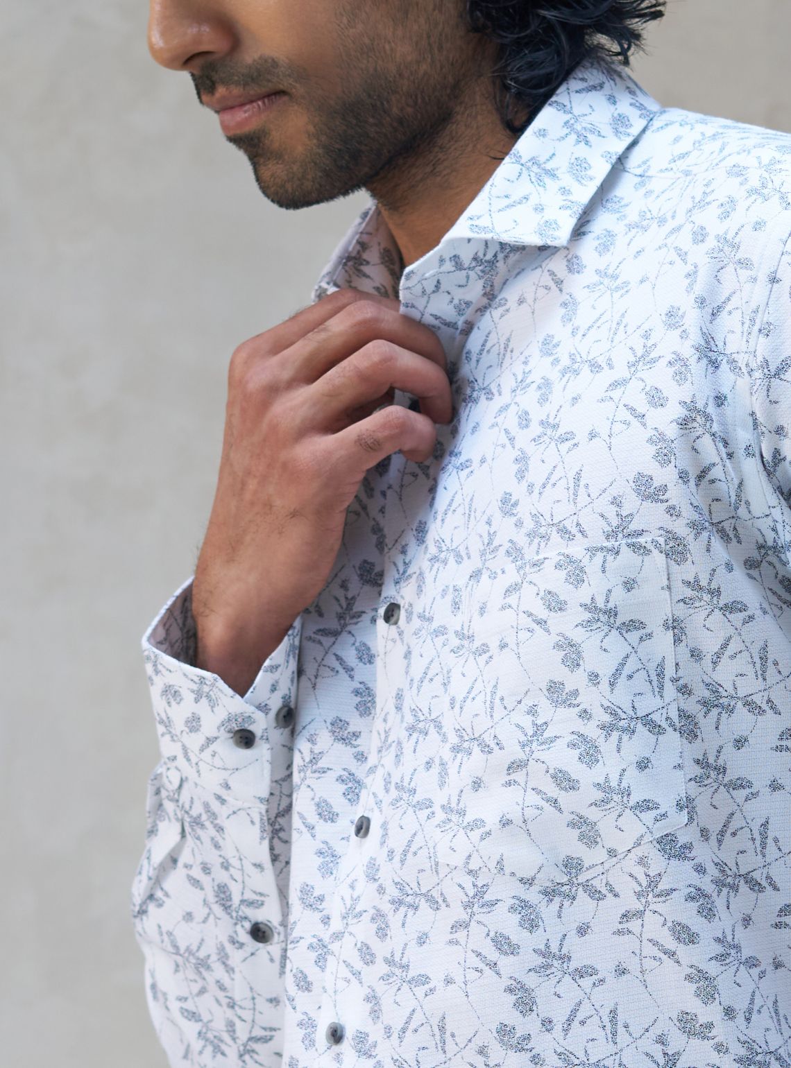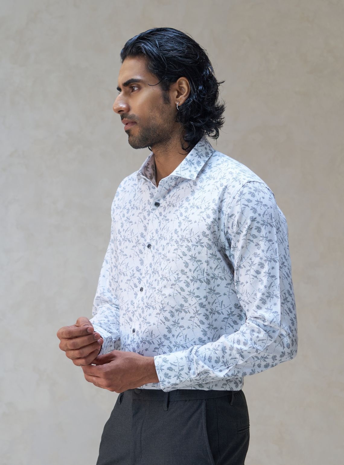 A perfect blend of minimalist design and premium comfort, this long-sleeved shirt is crafted from 100% high-quality cotton for a soft, breathable feel. It features a clean white base adorned with a delicate, all-over abstract twig and leaf pattern in a subtle slate grey. The design is finished with a traditional point collar, contrasting dark buttons, and a tailored fit for a sharp, modern look