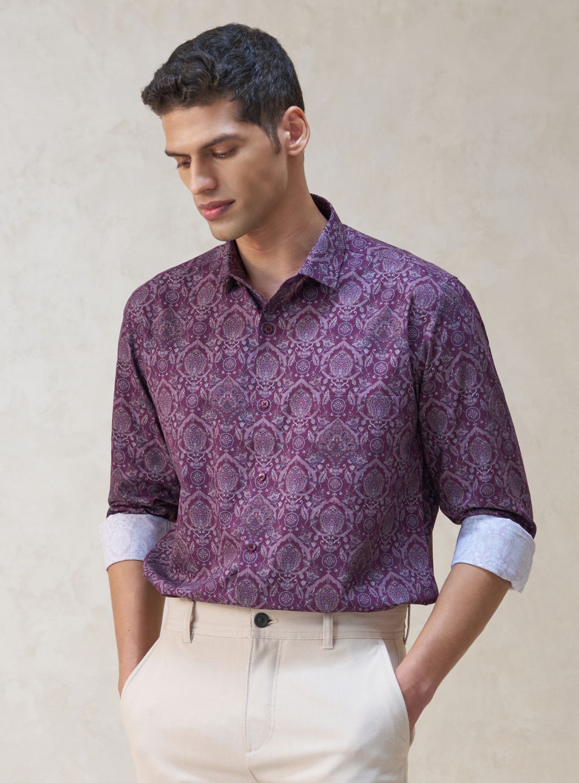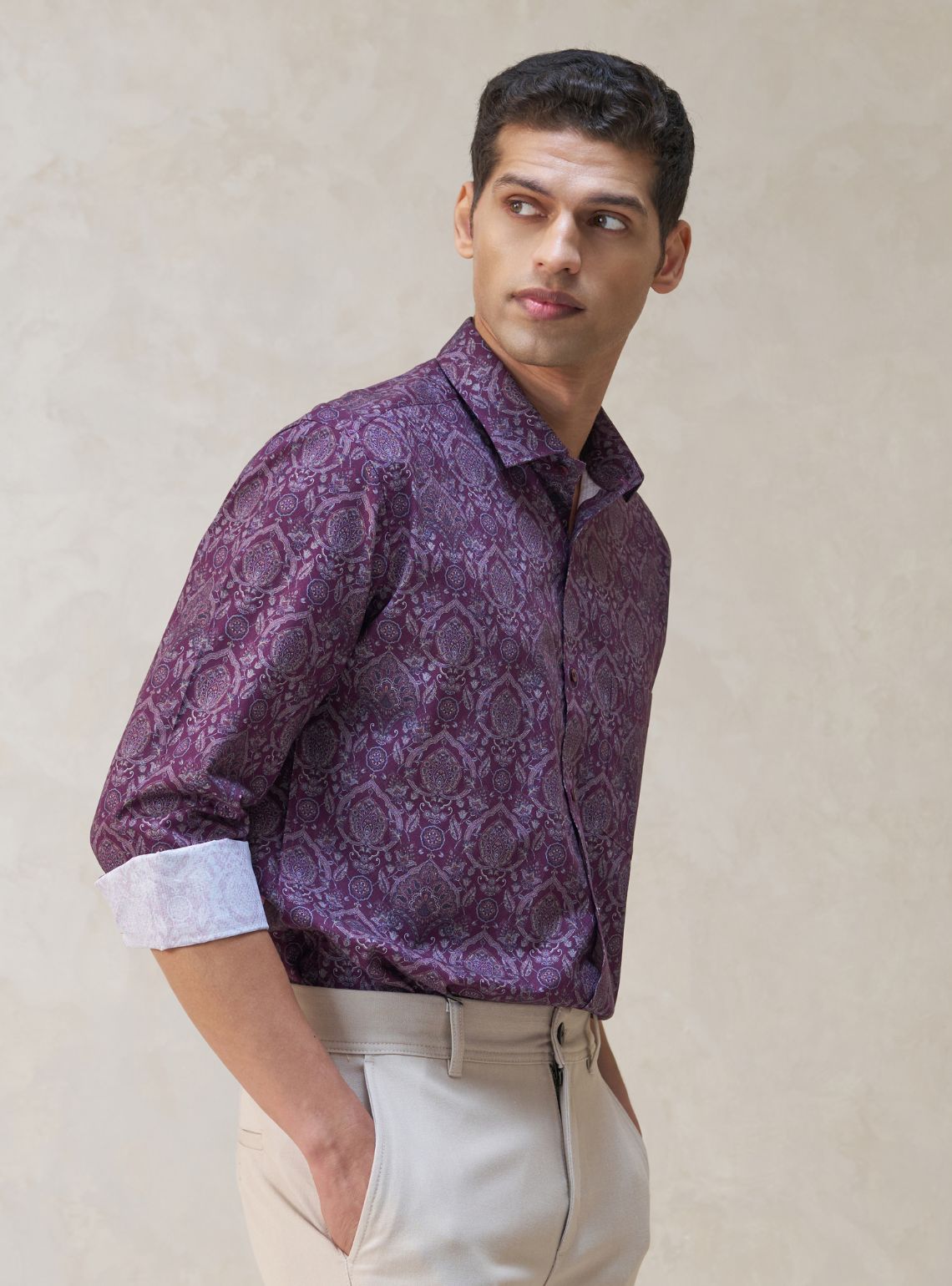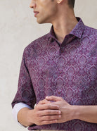 Exude timeless elegance with this intricate long-sleeved shirt, crafted from 100% premium cotton for a soft, breathable, and luxurious feel. It features a rich, all-over ornate paisley motif in shades of deep plum, burgundy, and soft lavender. This design is finished with a classic point collar, contrasting inner cuff detailing, and a tailored fit that ensures a modern, polished look for any high-end occasion