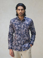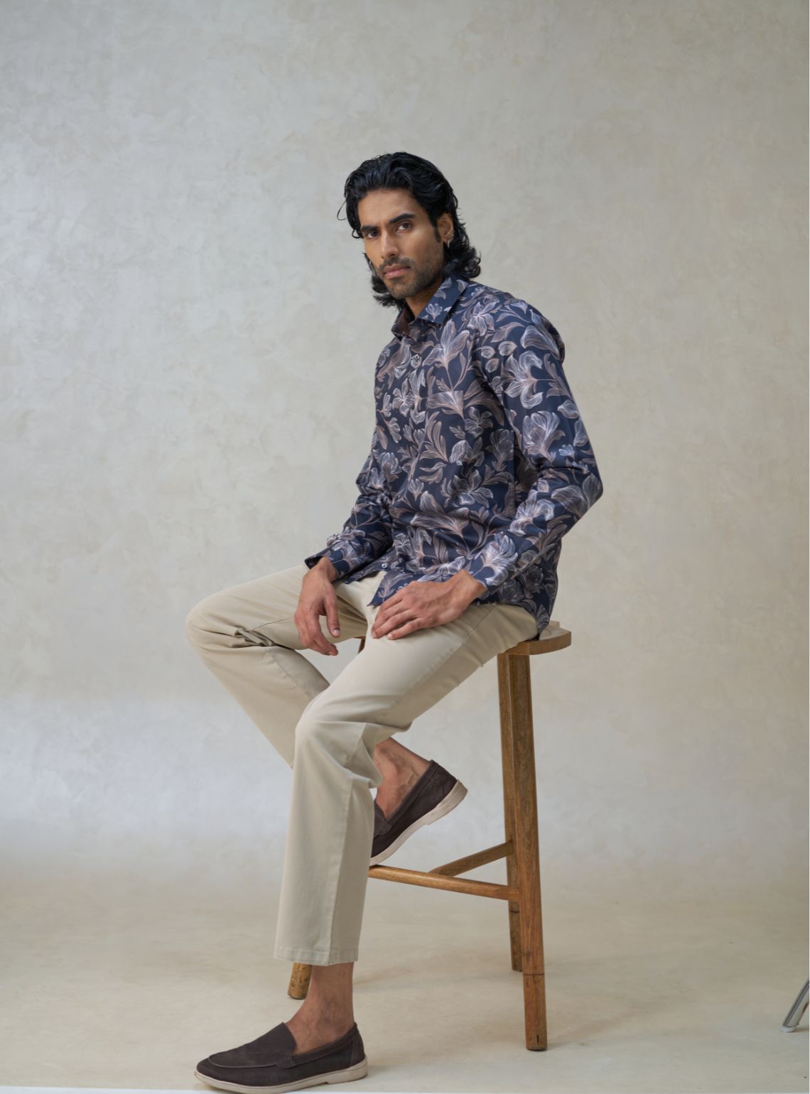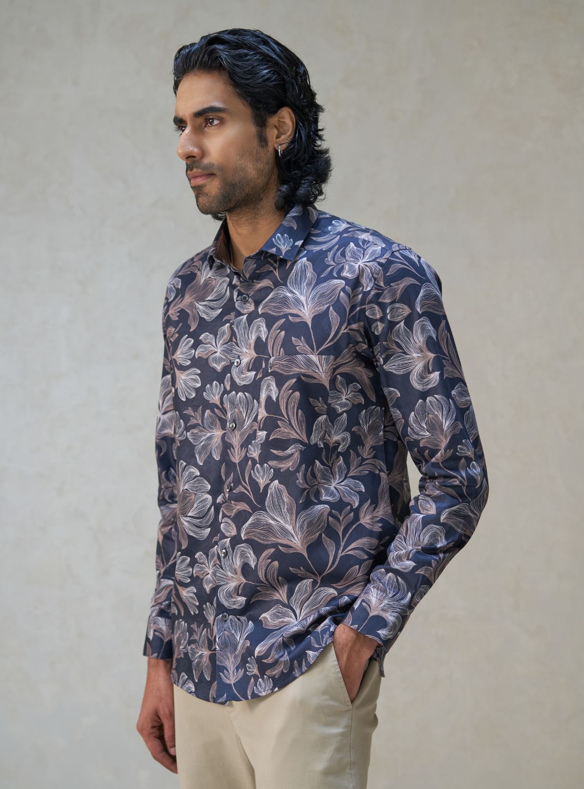 A versatile piece for the contemporary wardrobe, this long-sleeved shirt is crafted from 100% premium cotton for a lightweight and breathable feel. It features a clean white base adorned with a multi-tonal abstract leaf print in soft shades of sky blue, terracotta, and lavender. The design is finished with a classic point collar, a functional chest pocket, and a tailored fit for a sharp, refined silhouette