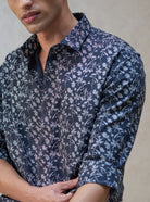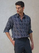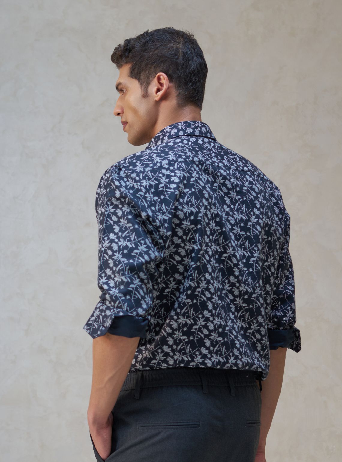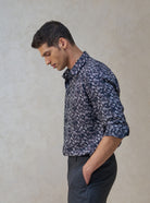 . A sophisticated take on a classic print, this long-sleeved shirt is crafted from 100% premium cotton for a soft feel and natural breathability. It features an elegant all-over floral twig pattern in white and lavender set against a deep navy blue base. Designed with a traditional point collar and a tailored fit, this shirt provides a sharp silhouette suitable for both smart-casual and evening wear