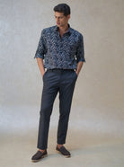 The dark aesthetic pairs perfectly with dark grey trousers or black denim for a polished evening look, or with light chinos for a high-contrast smart-casual vibe
