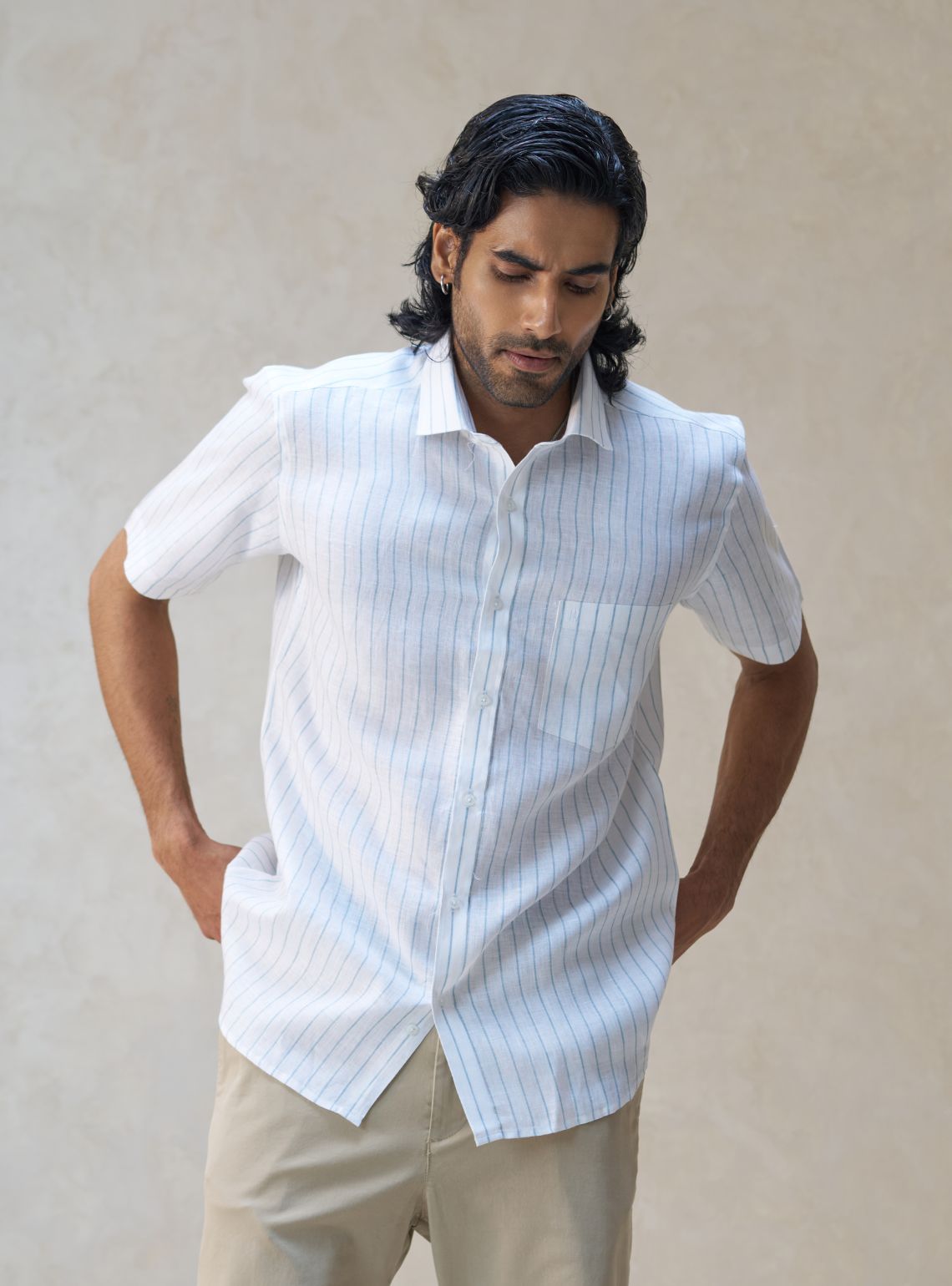A summer staple, this short-sleeve shirt is crafted from 100% pure linen for ultimate cooling. It features a clean white base with refreshing ocean blue vertical stripes, a functional chest pocket, and a sharp tailored fit. Perfect for warm-weather outings, it offers a refined, textured look that stays comfortable all day